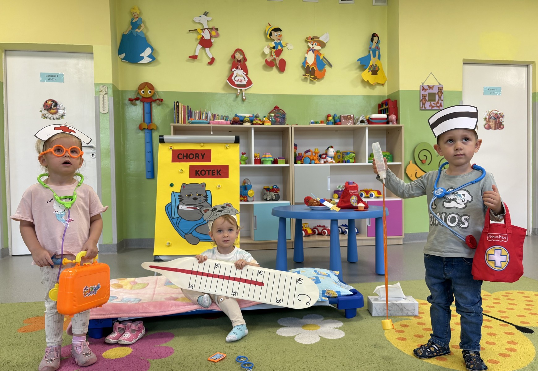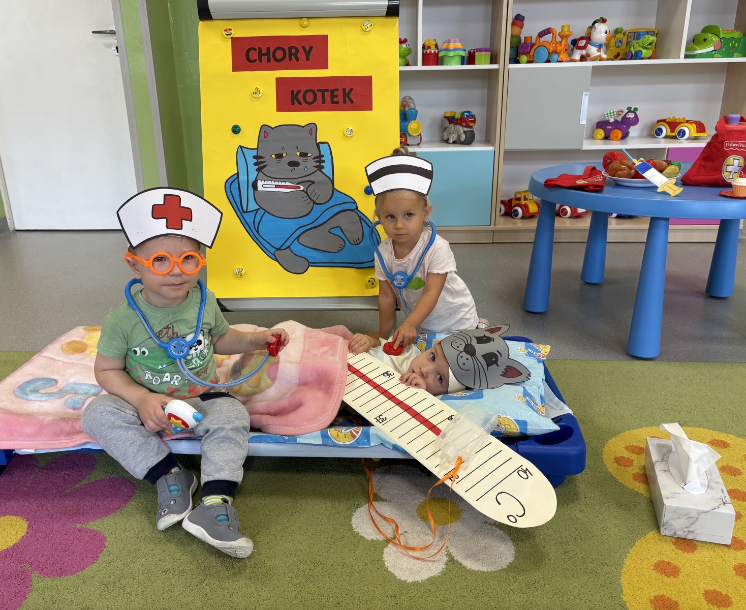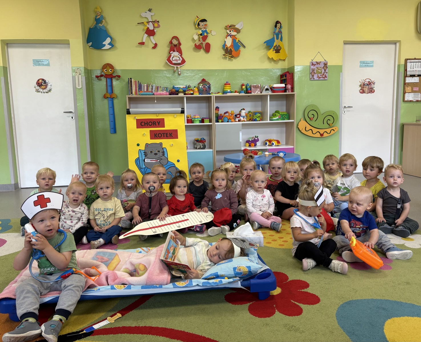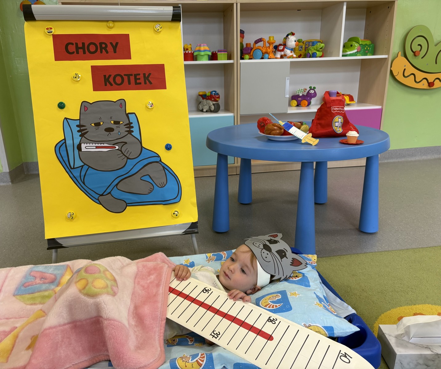 W naszym żłobku odbyły się wyjątkowe zajęcia poświęcone promocji zdrowego odżywiania. Dzieci przygotowały krótką inscenizację edukacyjną opartą na znanej rymowance o chorym kotku. W bajce kotek zachorował po zjedzeniu niezdrowych produktów i musiał przejść na specjalną dietę. Maluchy z entuzjazmem wcieliły się w role chorego kotka, pani pielęgniarki oraz pana doktora, ucząc się przy tym, jak ważne jest dbanie o zdrowie i wybieranie wartościowych posiłków. Zajęcia były świetną okazją do zabawy, a jednocześnie przekazały dzieciom ważną lekcję - że zdrowe jedzenie ma ogromny wpływ na nasze samopoczucie.