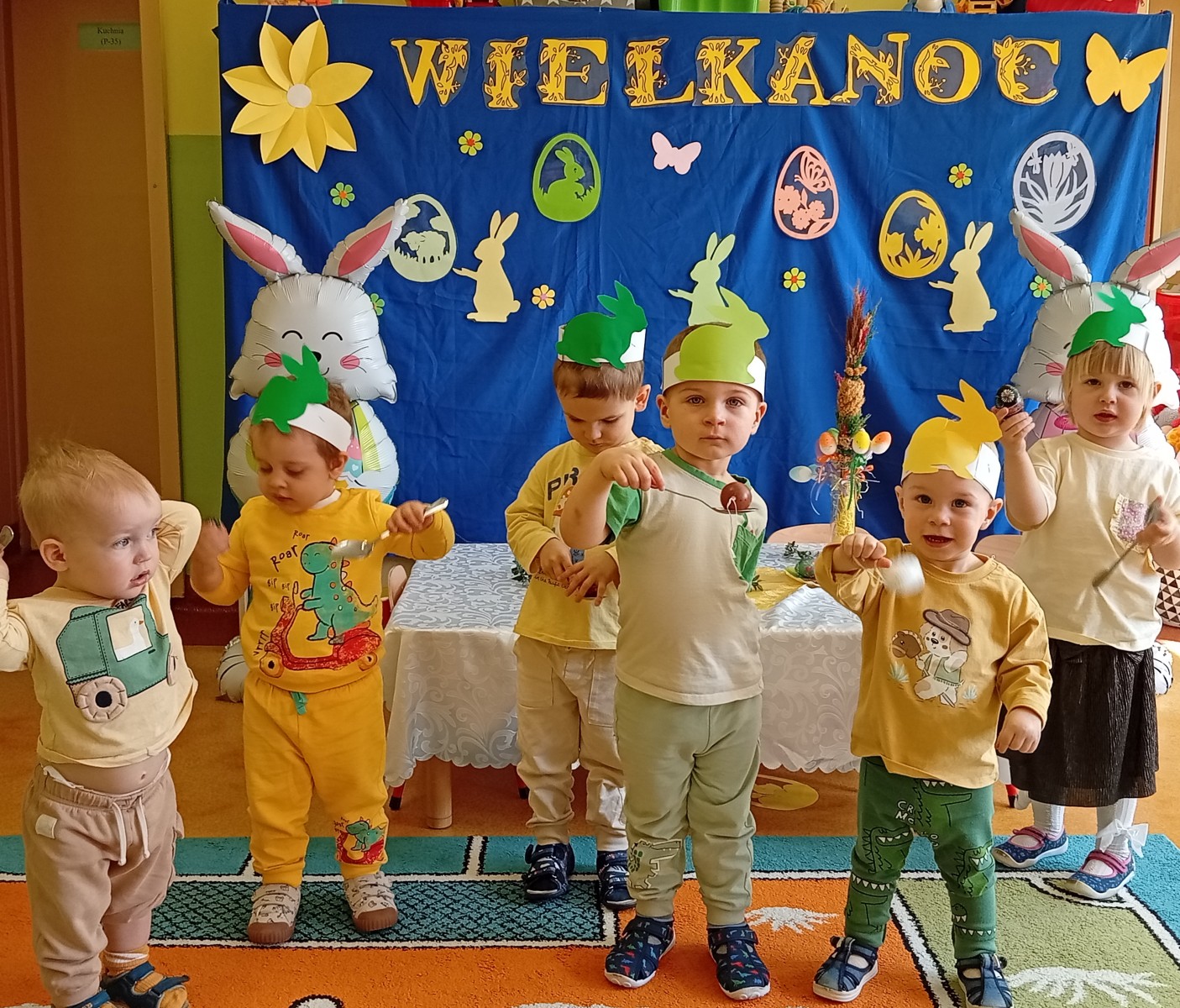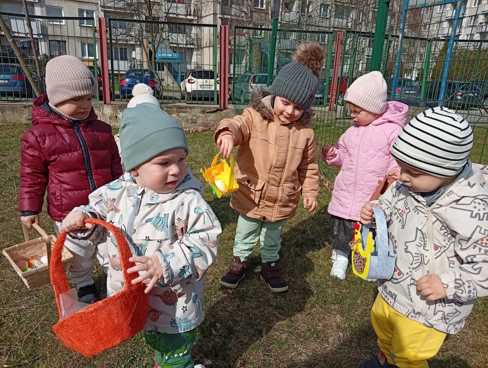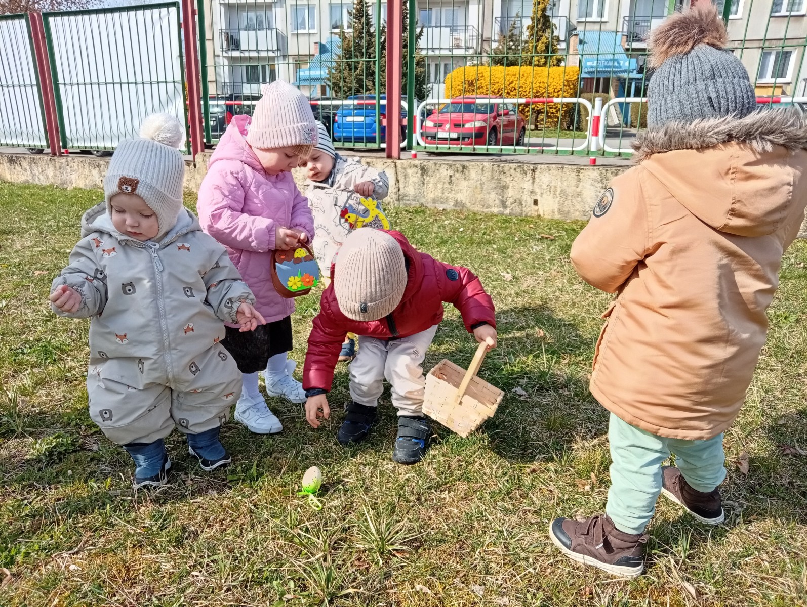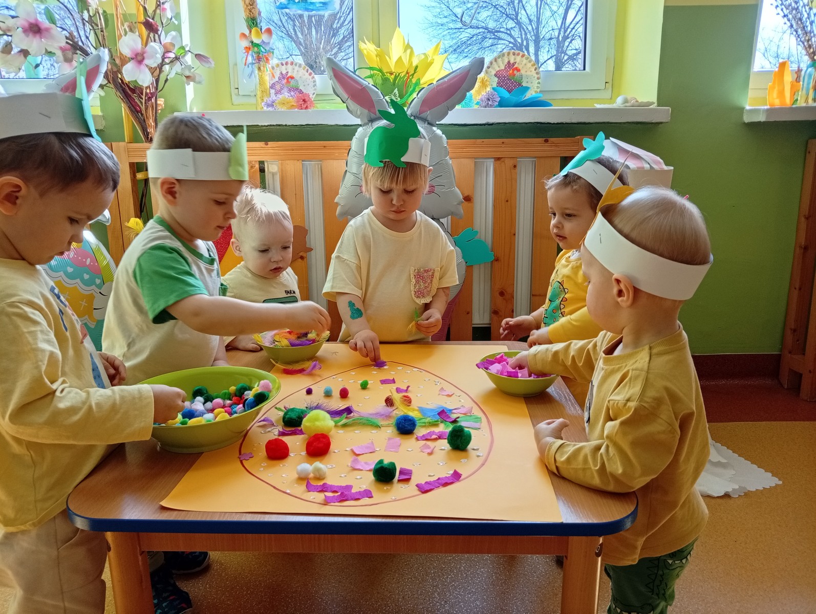 Nie zabrakło także działań plastycznych, podczas których dzieci z dużym zaangażowaniem tworzyły kolorowe pisanki oraz wyklejały kurczaczki, rozwijając swoją kreatywność i sprawność manualną. Radość sprawiły również zabawy ruchowe - wyścigi z jajkiem na łyżce, a także poszukiwanie ukrytych jajeczek, które dostarczyło dzieciom wielu pozytywnych emocji.