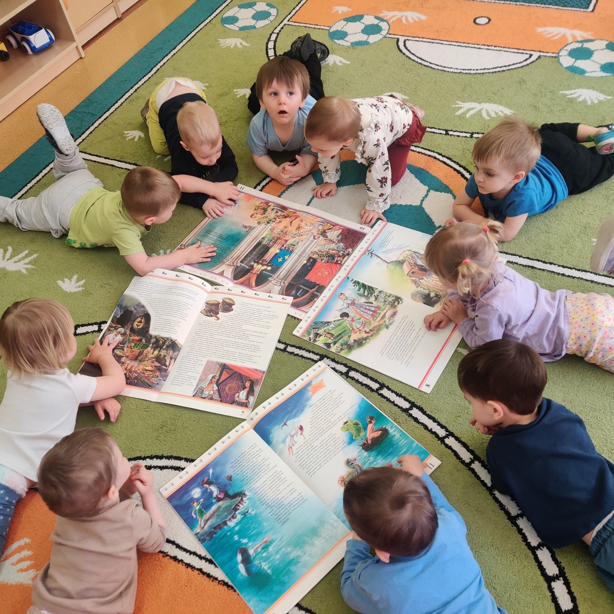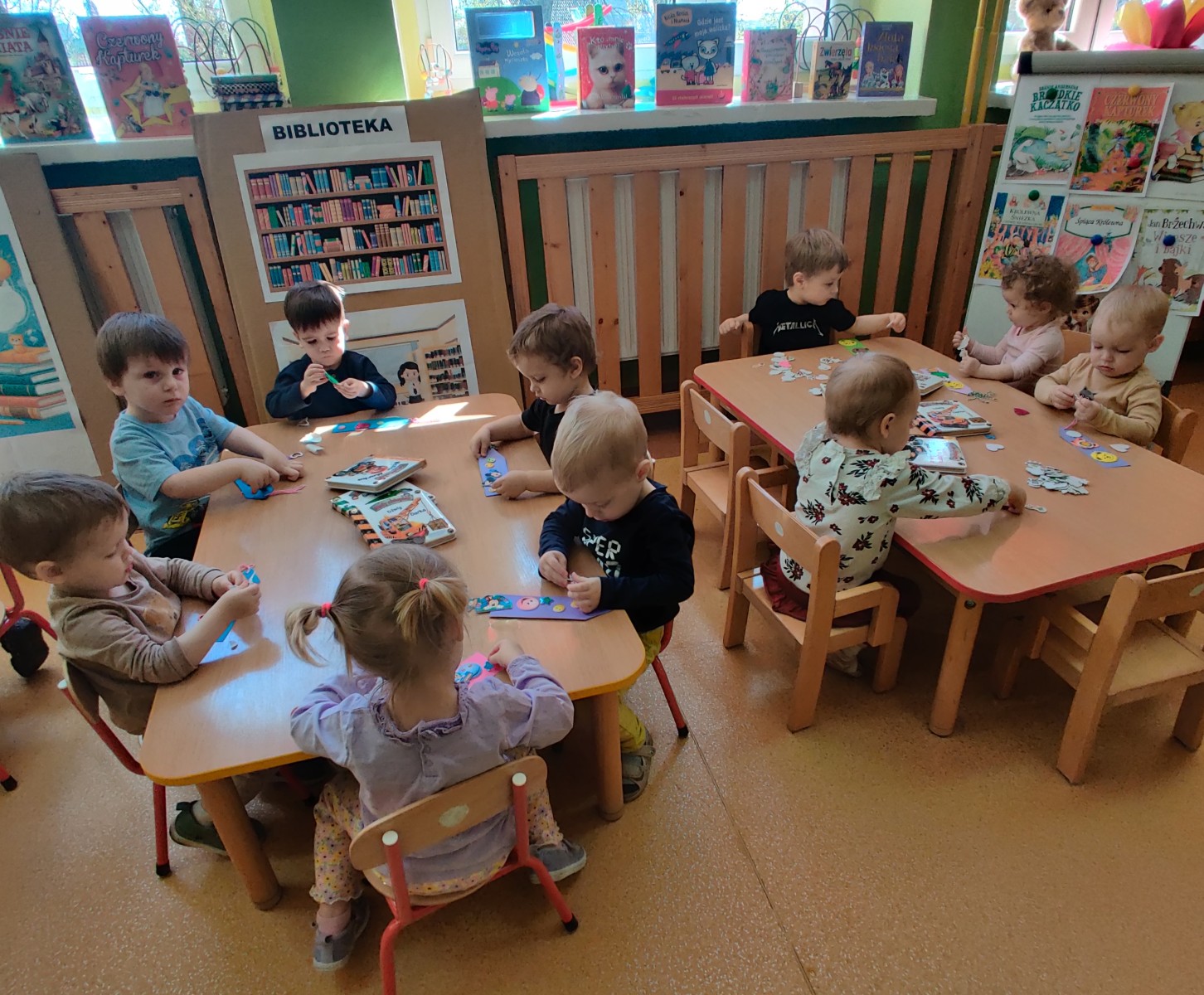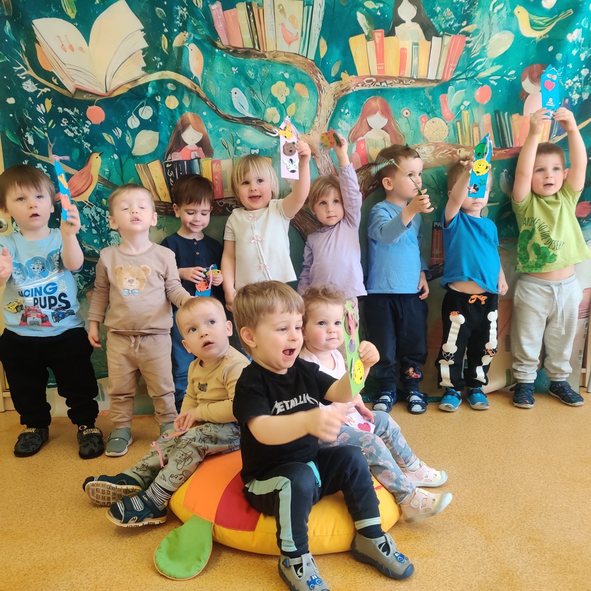 W grupie Misie obchodziliśmy wyjątkowy Dzień Książki. Celem zajęć było rozbudzanie zainteresowania książkami oraz pokazanie dzieciom, że czytanie może być źródłem radości, zabawy i ciekawych odkryć. Podczas spotkania maluchy oglądały kolorowe książeczki dostosowane do swojego wieku, poznawały ilustracje oraz uczyły się, jak należy dbać o książki. Zajęcia rozpoczęły się wspólnym czytaniem opowieści, które wzbudziły w dzieciach wiele emocji i zainteresowania. Następnie dzieci chętnie uczestniczyły w rozmowach na temat bohaterów i wydarzeń z książek. Nie zabrakło również wizyty w żłobkowej biblioteczce oraz kreatywnej pracy plastycznej - dzieci wykonały własne zakładki do książek. Był to dzień pełen radości, rozwijania wyobraźni, mowy oraz budowania pozytywnych skojarzeń z książką już od najmłodszych lat.