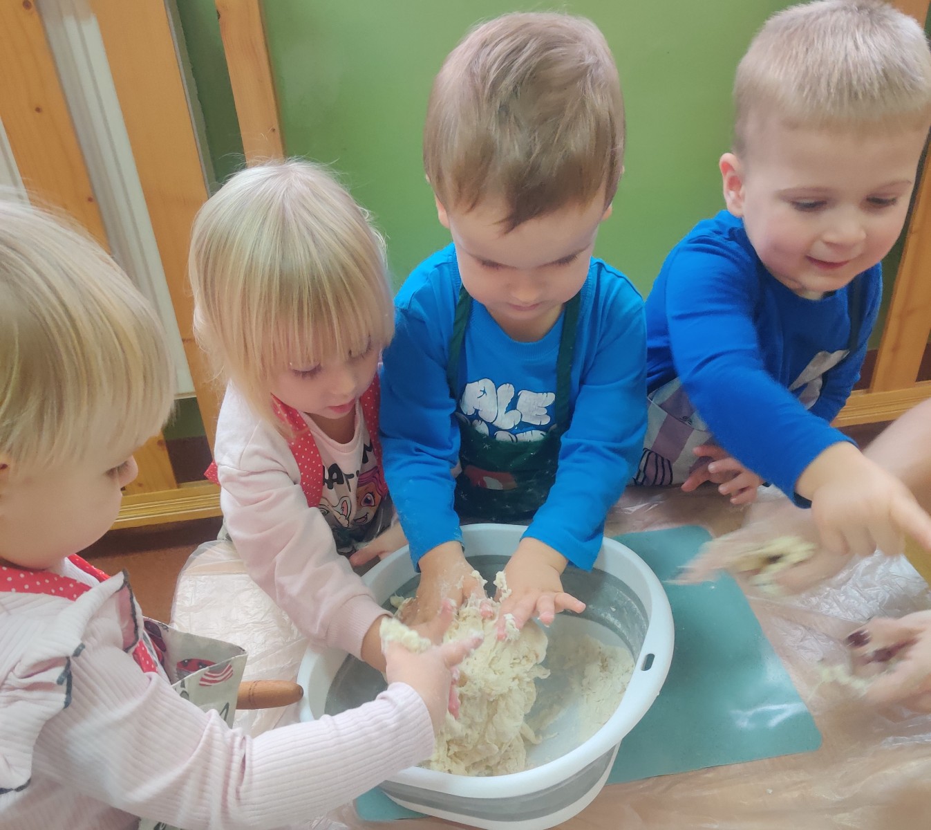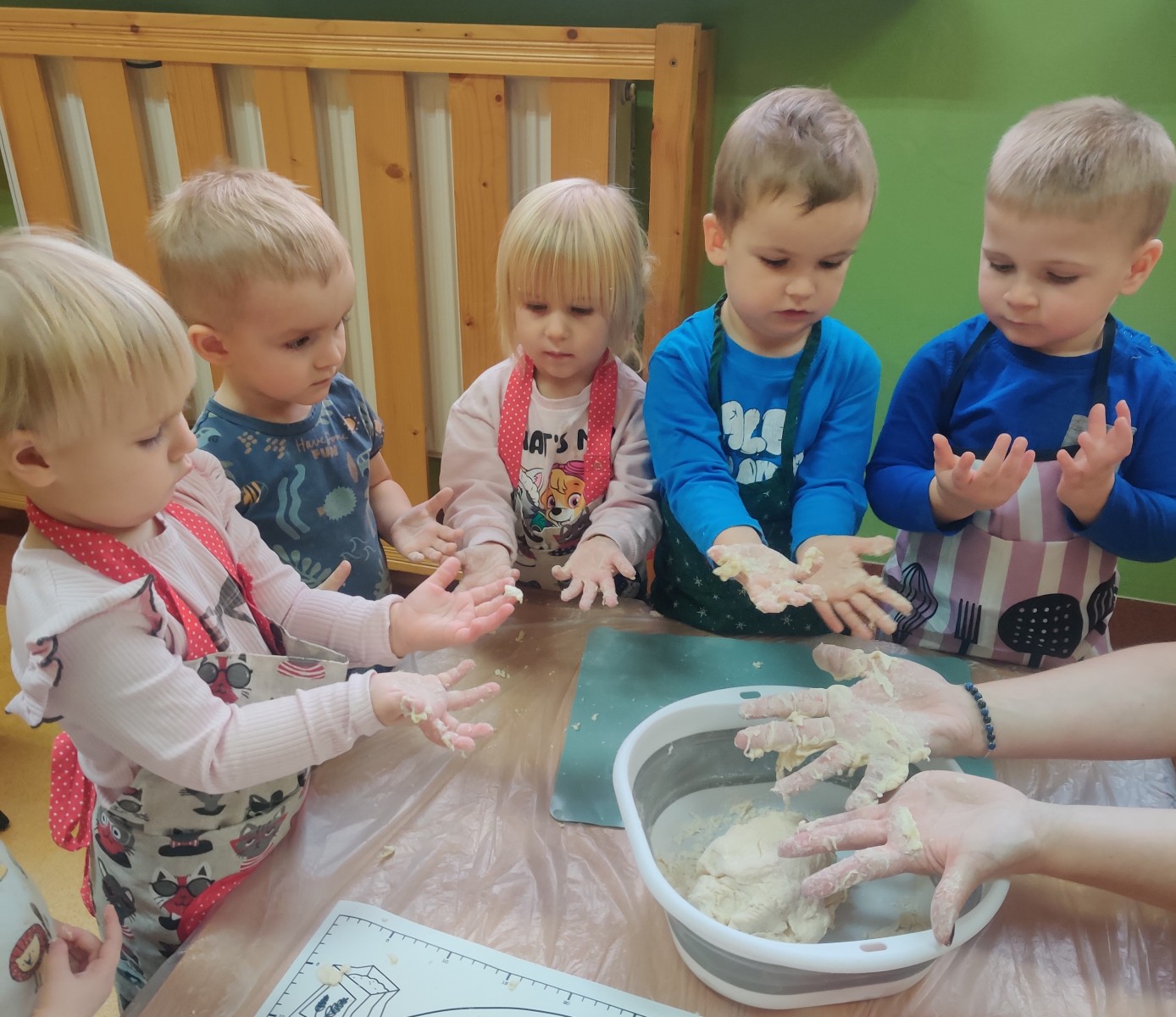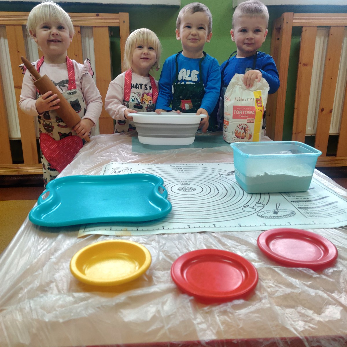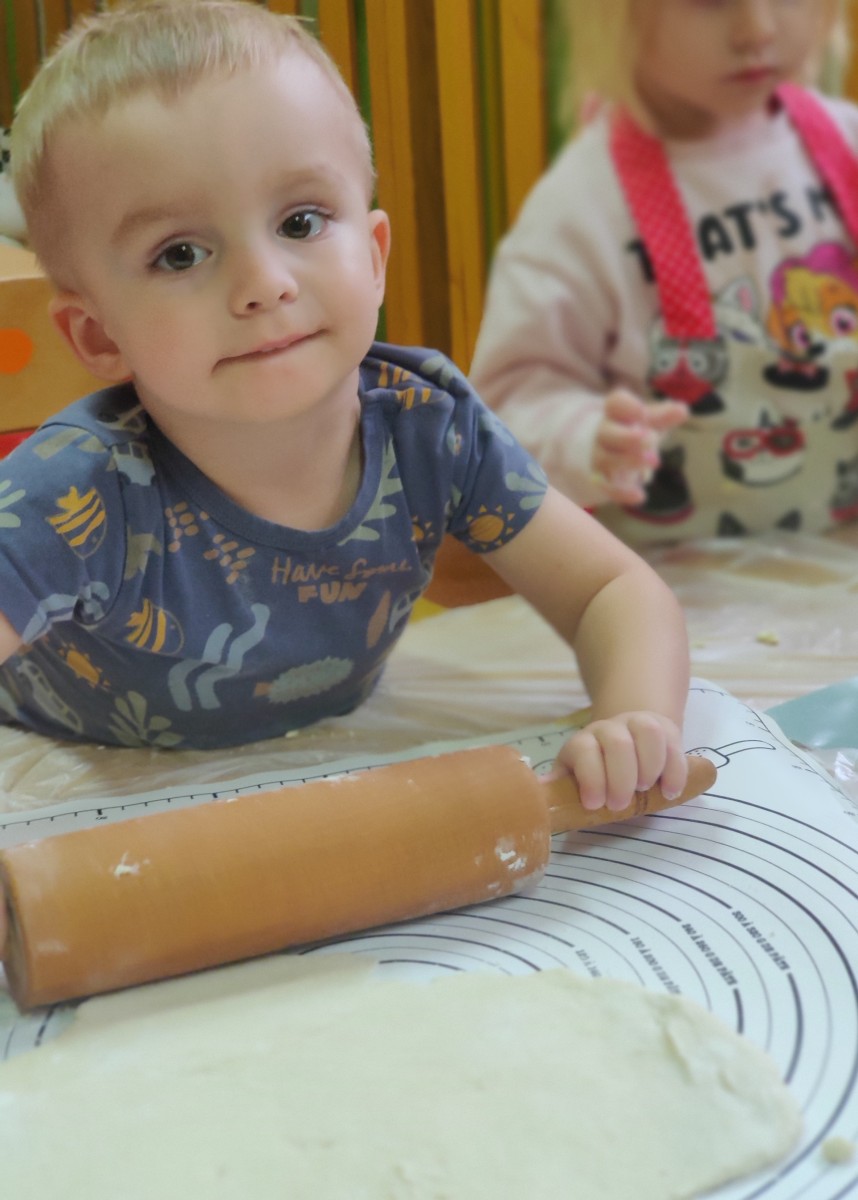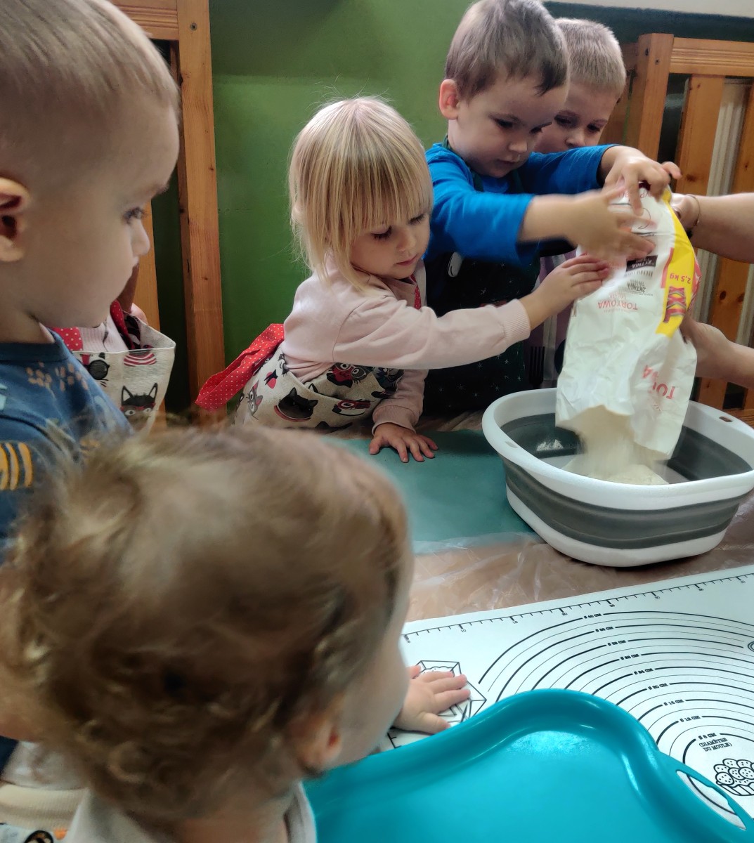 24 października dzieci z grupy Misie zamieniły się w małych kucharzy. Z pomocą cioć przygotowały pyszne ciasto, ucząc się przy tym wielu nowych rzeczy. Ubrane w fartuszki, samodzielnie odmierzały składniki, poznawały kolory i konsystencję mąki, a następnie ugniatały i wałkowały ciasto. Takie zajęcia sensoryczne to nie tylko świetna zabawa, ale również doskonałe wsparcie rozwoju - dzieci ćwiczą motorykę małą, koordynację ręka-oko, rozwijają zmysł dotyku i uczą się współpracy. Misie spisały się na medal - w kuchni panowała radość, ciekawość i zapach domowego ciasta.