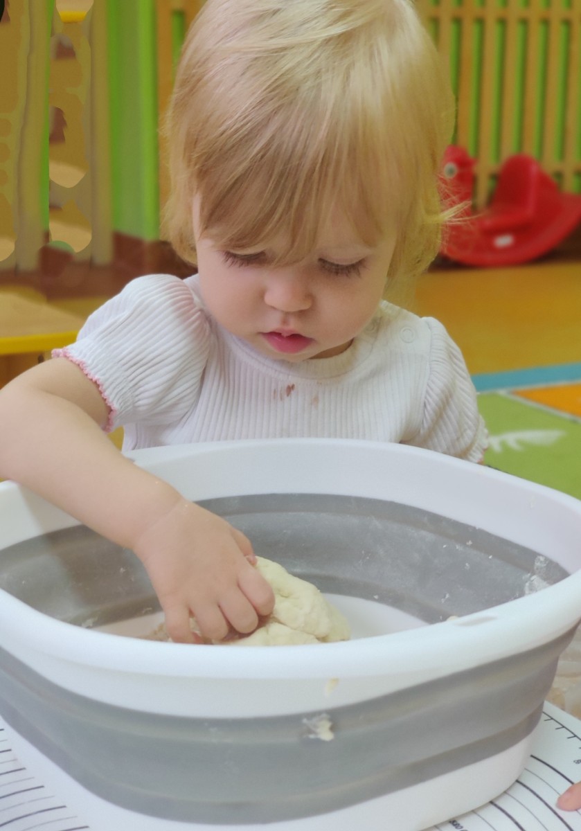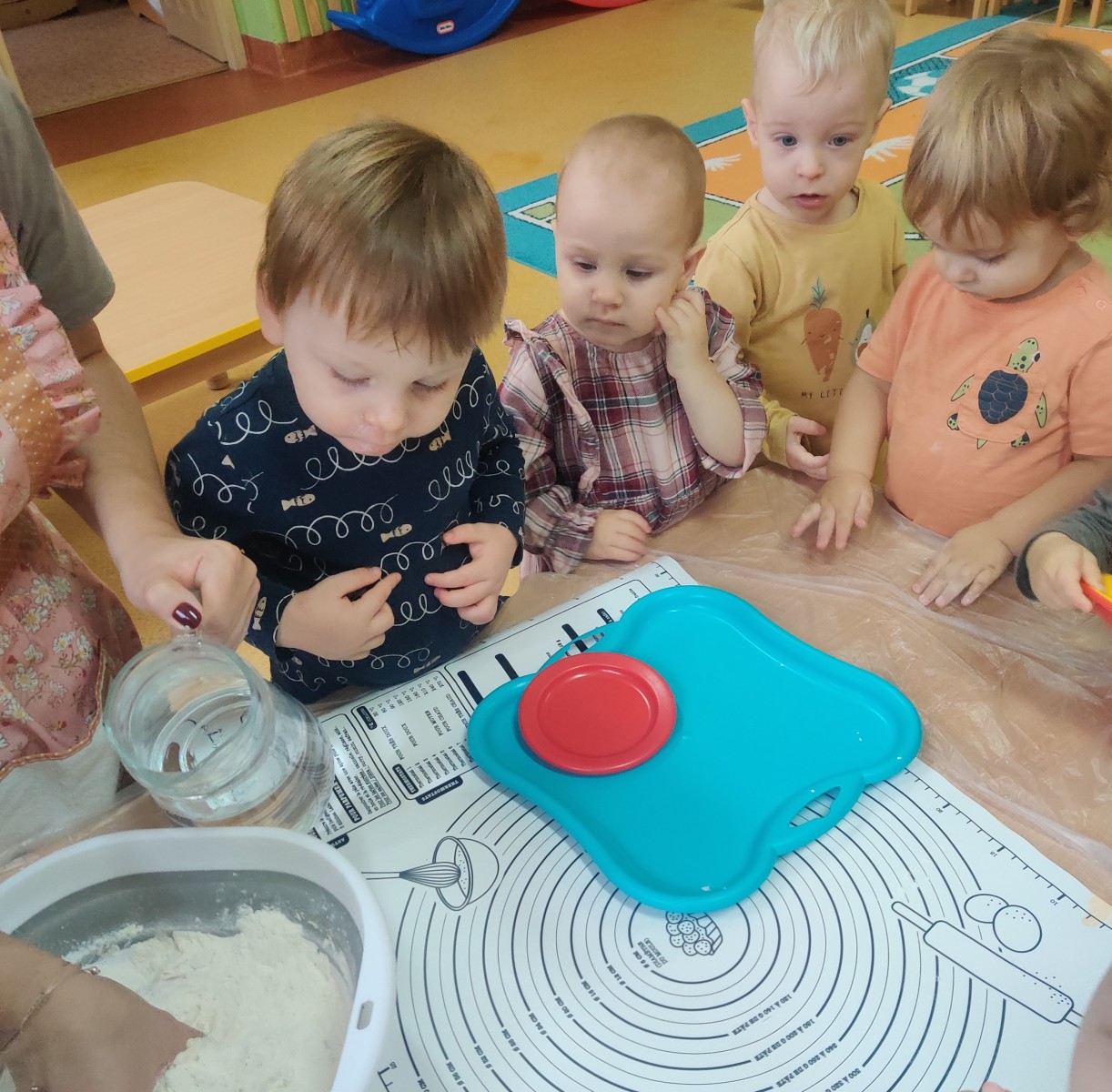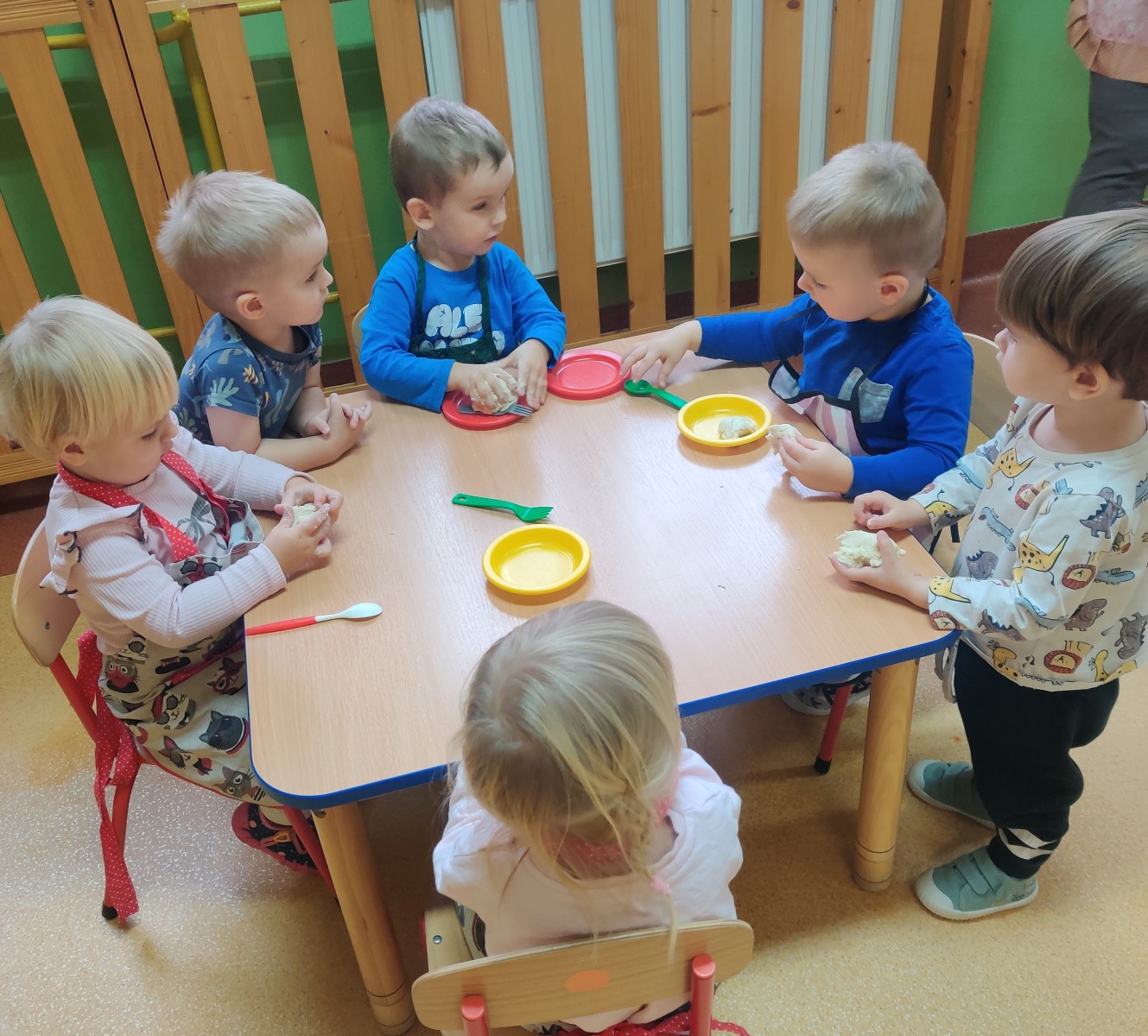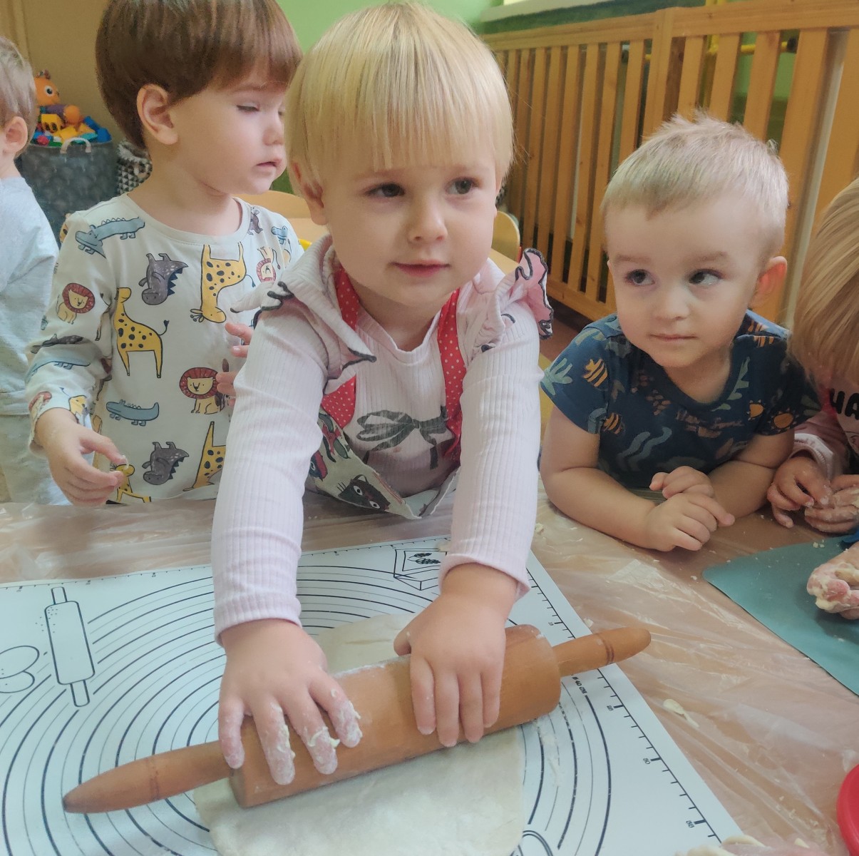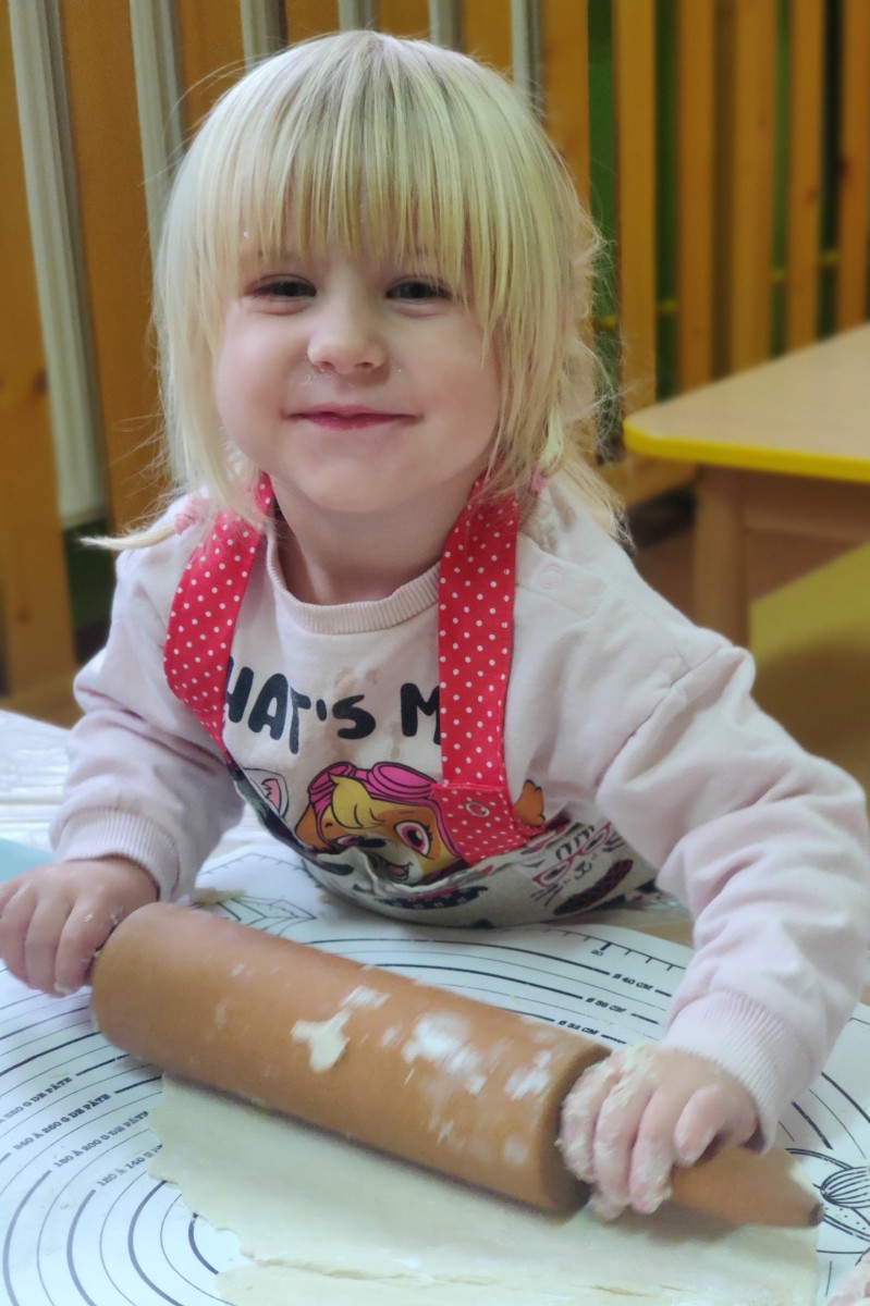 24 października dzieci z grupy Misie zamieniły się w małych kucharzy. Z pomocą cioć przygotowały pyszne ciasto, ucząc się przy tym wielu nowych rzeczy. Ubrane w fartuszki, samodzielnie odmierzały składniki, poznawały kolory i konsystencję mąki, a następnie ugniatały i wałkowały ciasto. Takie zajęcia sensoryczne to nie tylko świetna zabawa, ale również doskonałe wsparcie rozwoju - dzieci ćwiczą motorykę małą, koordynację ręka-oko, rozwijają zmysł dotyku i uczą się współpracy. Misie spisały się na medal - w kuchni panowała radość, ciekawość i zapach domowego ciasta.
